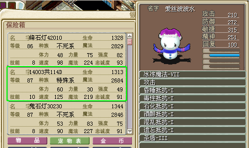 宠物 | 档次 | 等级 | 加点 | 价格 | 账号 | 水龙 | 00204 | 67 | 血 | 5J | lhd1+ | 蓝TL | 00110 | 74 | 攻 | 8J | J2005+ | 绿TL | 10300 | 14 | 攻 | 1W | lhd1+ | 火刀 | 00402 | 48 | 魔 | 1J | J2005+ |